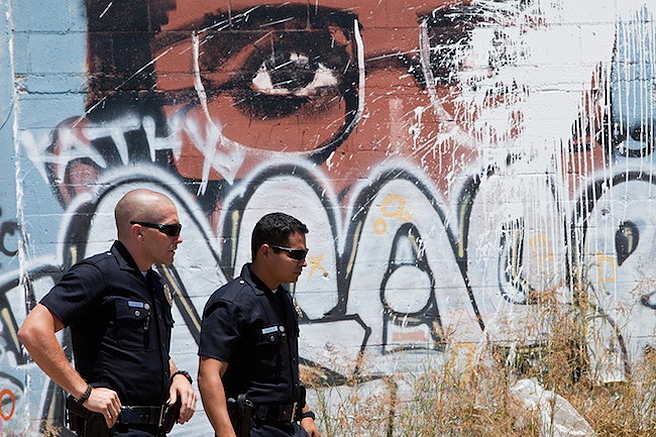 Part of that is Ayer’s technique. Recognizing that nothing happens nowadays that isn’t captured by some sort of recording device (the police learned this the hard way with the Rodney King beatdown), Ayer presents his story largely as “found footage” captured by surveillance cameras, police dashboard cams and cell phones. And then there are the images recorded by cop Brian Taylor (Gyllenhaal), a techno geek of the first order who pins mini-cams on himself and his partner, Mike Zavala (Pena), wires his police cruiser for sight and sound, and often carries his own digital camera onto crime scenes.