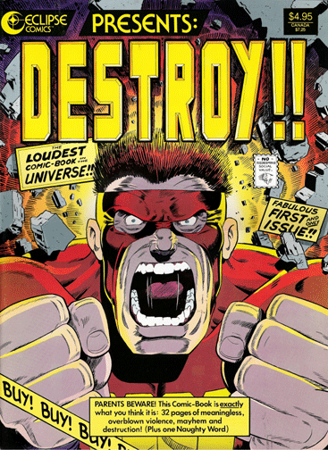 Actually, the climactic, endless smackdown owes a huge debt to Scott McCloud’s hard-to-find, single issue comic “DESTROY!!” from the mid 1980s. It depicted the destruction of a perfectly-rendered lower Manhattan in a fight between two superheroes and carried the warning “PARENTS BEWARE! This Comic-Book is exactly what you think it is: 32 pages of meaningless, overblown violence, mayhem and destruction!”