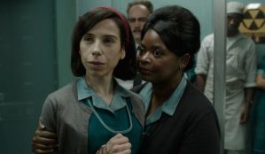 Set in early ’60s Baltimore, where it’s always raining and everything is tinted bottom-of-the-sea green, “The Shape of Water” opens with Elisa ( Sally Hawkins) awakening from a watery dream and getting ready for work. Elisa is mute and communicates through sign language (we get subtitles); she works the night shift mopping floors at a top-secret government research station that looks and feels like a giant concrete mausoleum.
