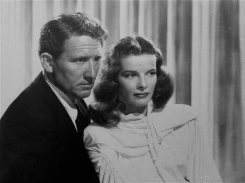 Actor Spencer Tracy is shown posing with longtime companion and co-star Katharine Hepburn during their heyday, date and film not known