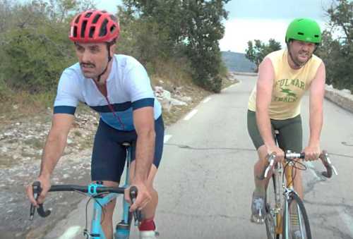The bar is set high with the very first scene. Old buddies Mike and Kyle are pedaling their racing bikes up a mountain in France. Mike, the more experienced rider, is pep-talking his out-of-shape pal into meeting the challenges of the climb.