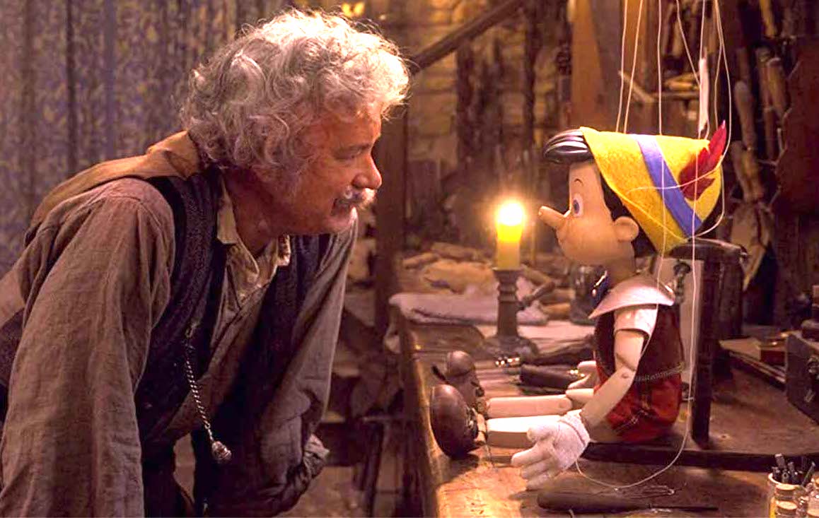 It’s weird, but I find myself responding emotionally to the cartoon (for instance, Geppetto’s heartbreaking longing for a son) when the same scenes, played out with a real actor (Tom Hanks, working to project from behind an Einstein-level ‘stache and wig of exploding hair) feel phony.