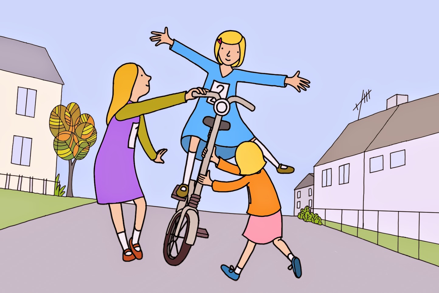 The girls envy the utterly unremarkable family living below their apartment, especially the bicycles ridden by that family’s children. Mama and Papa finally agree to buy a bicycle, but not just any bike. It’s an English-made Moulton, a high-end contraption that guarantees the girls will never quite fit in.