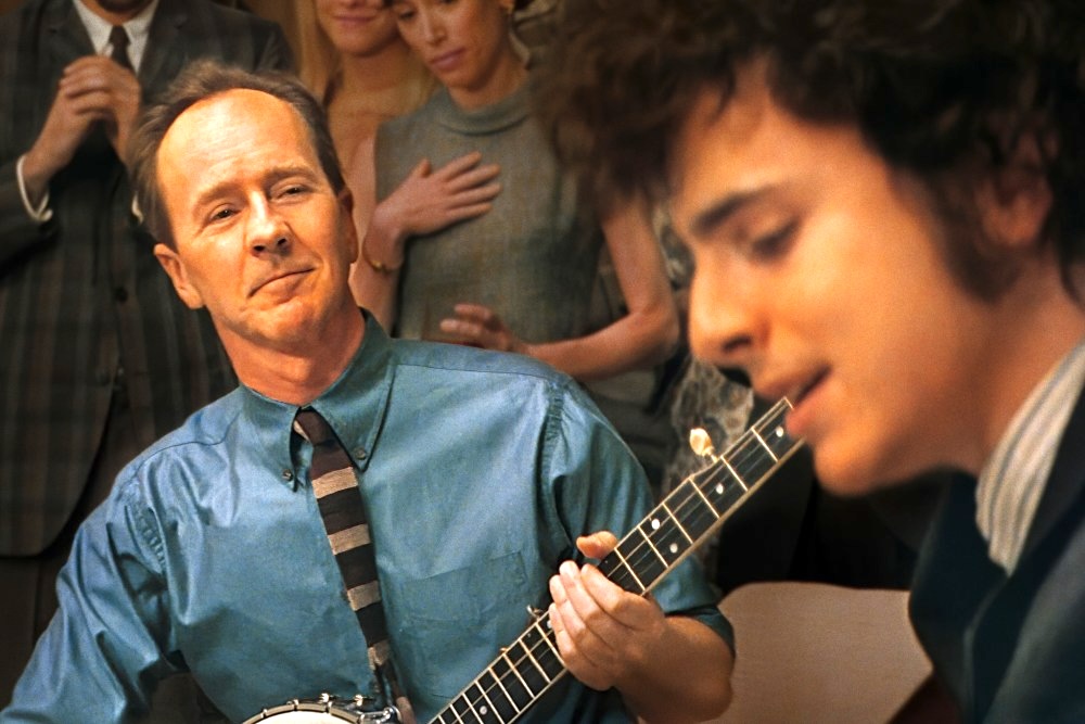 Edward Norton as Pete Seeger, Timothee Chalomet as Bob Dylan