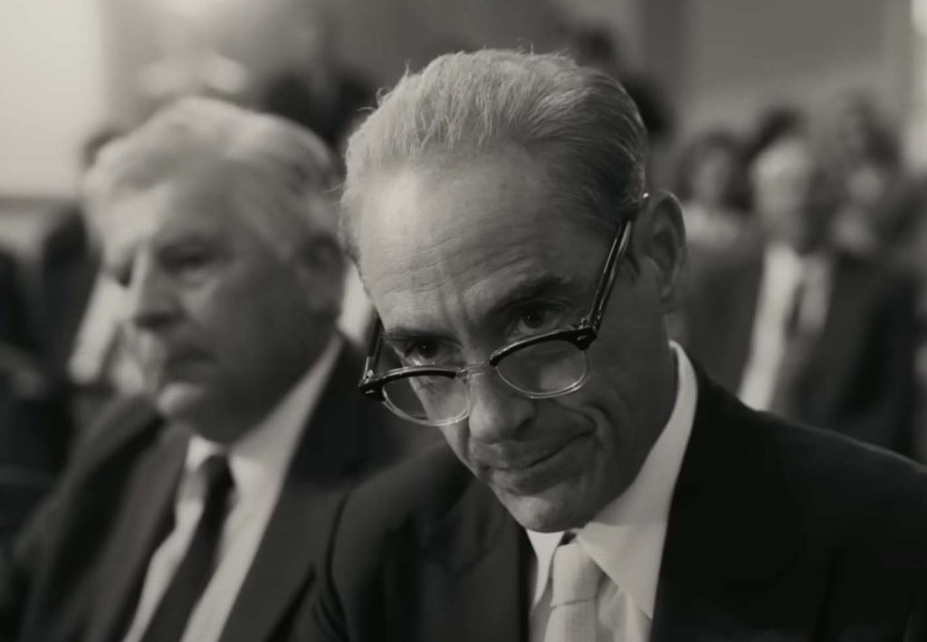 And then (in black-and-white footage) we witness the 1959 Senate confirmation hearing of Lewis Strauss (Robert Downey Jr., in a career-high performance). Strauss is the former AEC chair and Eisenhower’s nominee for Secretary of Commerce. Many of the questions aimed at him concern his relationship over the years with Oppenheimer, whose reputation by this time is marred by the widespread belief that he was a Communist sympathizer.